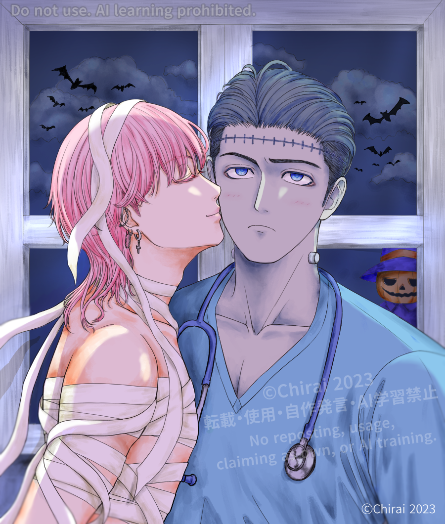 Dr.フランケンシュタインを誘うミイラ男 2024.11.17 Dr.フランケンシュタインを誘うミイラ男 2023 ミイラ男は、担当医のフランケンシュタインを自室へ呼び出し、治療への感謝を込めてキスをした。挑発的な仕草に、Dr.フランケンシュタインは複雑な感情が入り混じった表情を浮かべるのだった。 そんなシチュエーションのハロウィンイラストです。フランケンシュタインって、本当は怪物を造った科学者の名前だったんですね。 イラスト一覧